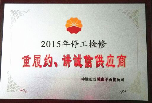 2015年10月28日,在中油股份独山子石化公司2015年度停工检修总结表彰大会上,鲁阳公司被评为重履约、讲诚信供应商。新疆独山子石化公司停工大修每四年一次,今年的大修历时两个月,270余家供应商参与。鲁阳公司作为唯一一家耐火材料供应商,履约及时、服务到位,产品质量好,得到了客户的高度评价,从众多供应商中脱颖而出,成为20家重履约、讲诚信供应商之一,为公司争得了荣誉。